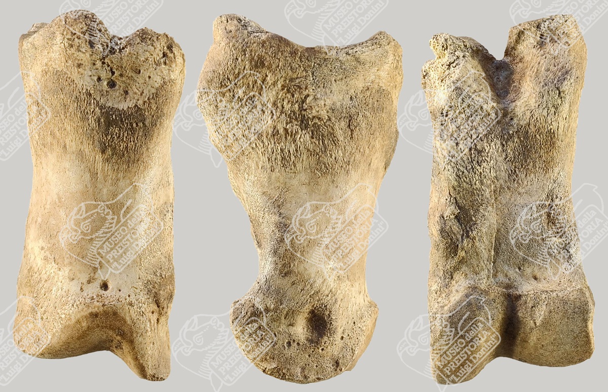 Prima falange di Bisonte delle steppe in norma dorsale (sinistra), in norma laterale (centrale) e in norma palmare (destra)