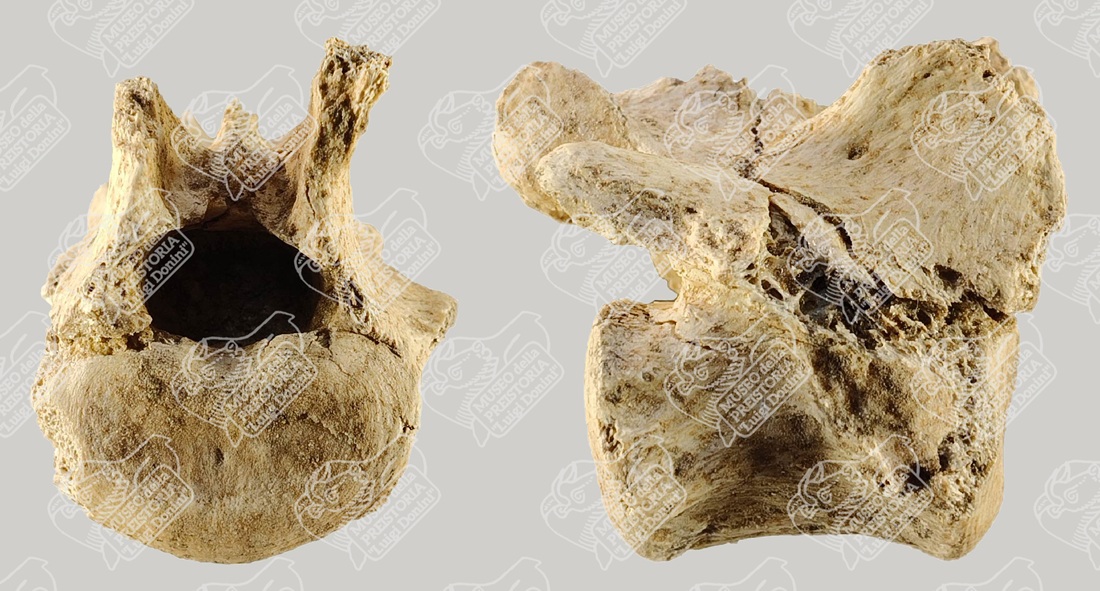 Vertebra toracica di Lupo in norma craniale (sinistra) e laterale (destra)