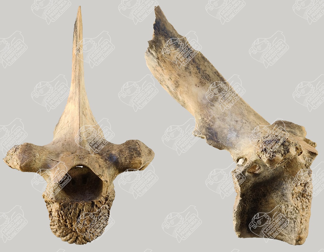 Vertebra toracica di Bisonte delle steppe in norma craniale (sinistra) e in norma laterale (destra)