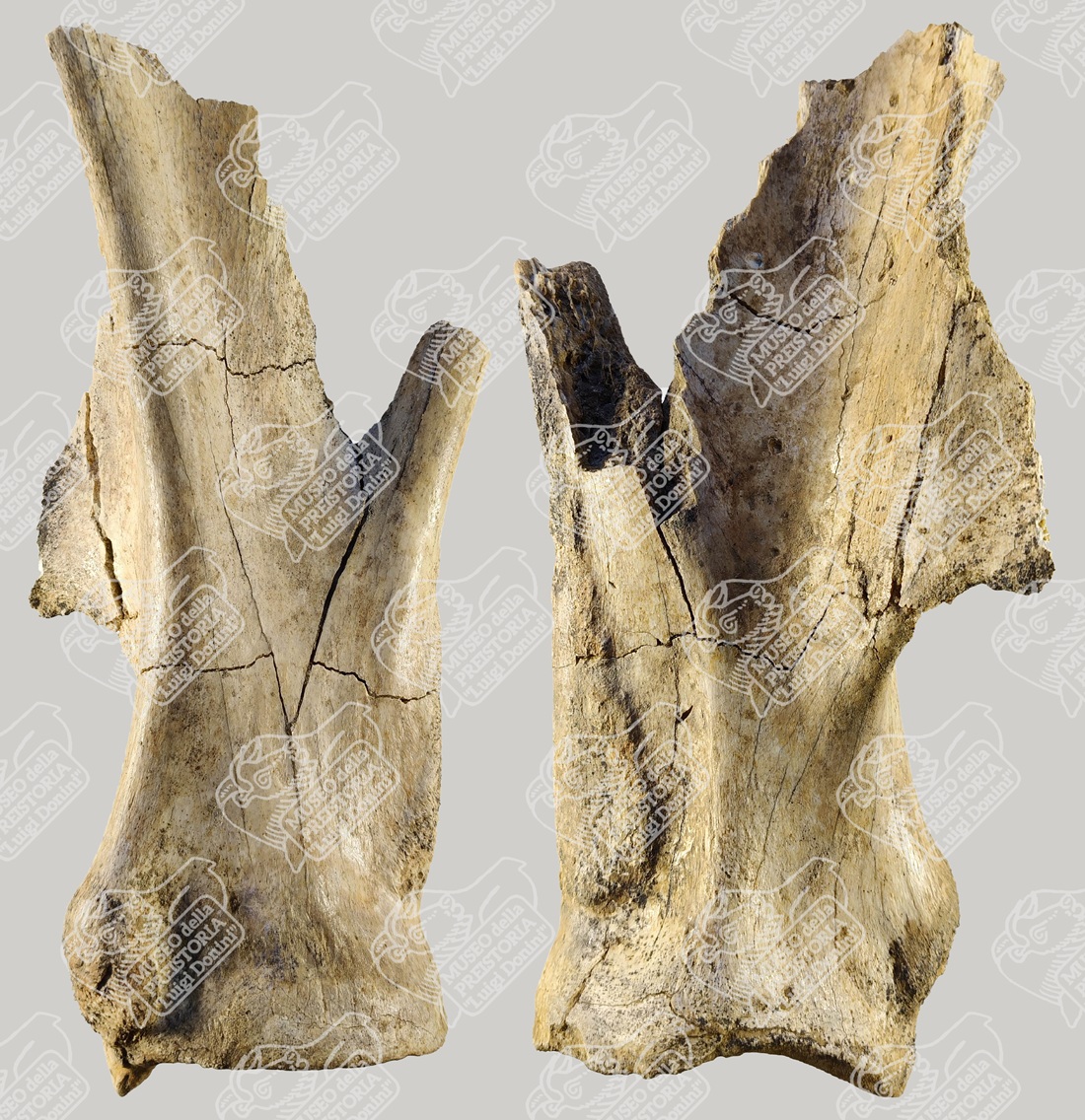 Frammento di scapola di Bisonte delle steppe in norma mediale (sinistra) e laterale (destra)