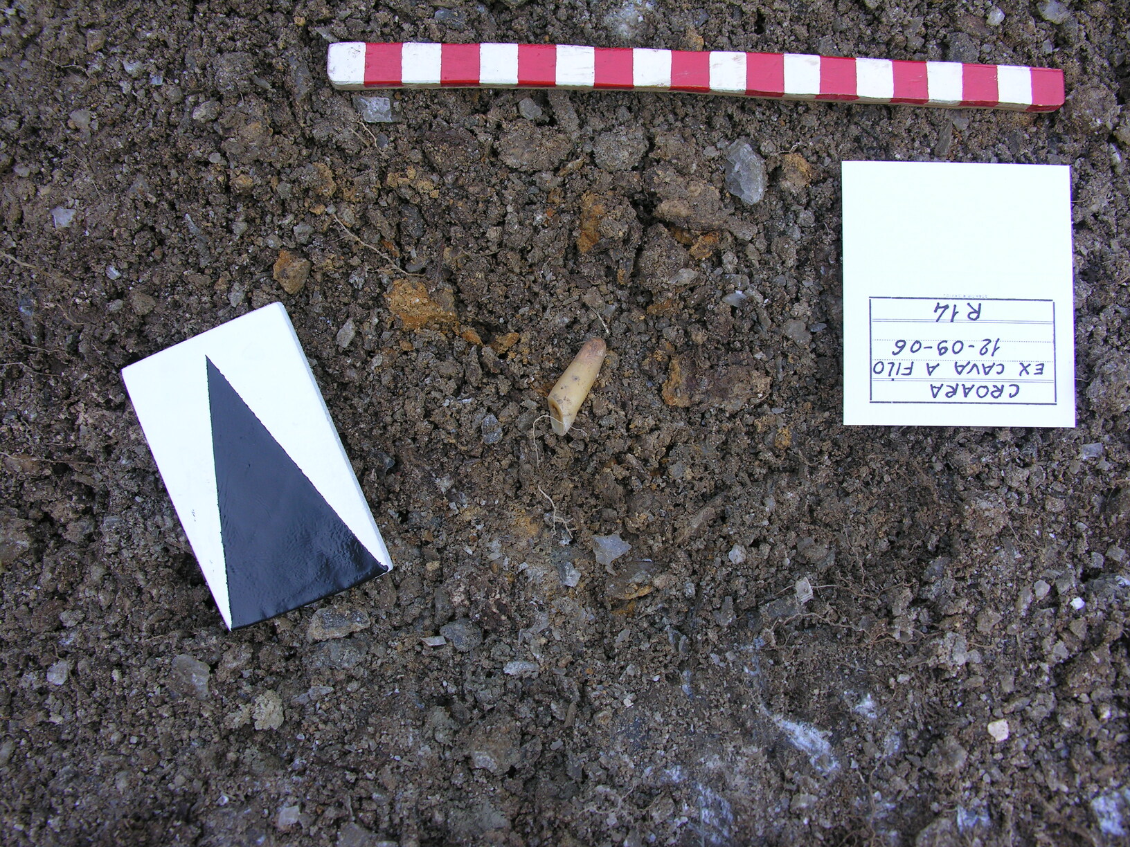 Fotografia che ritrae un incisivo di bovide (reperto R.14), caratterizzato da un forte grado di usura, in fase di scavo