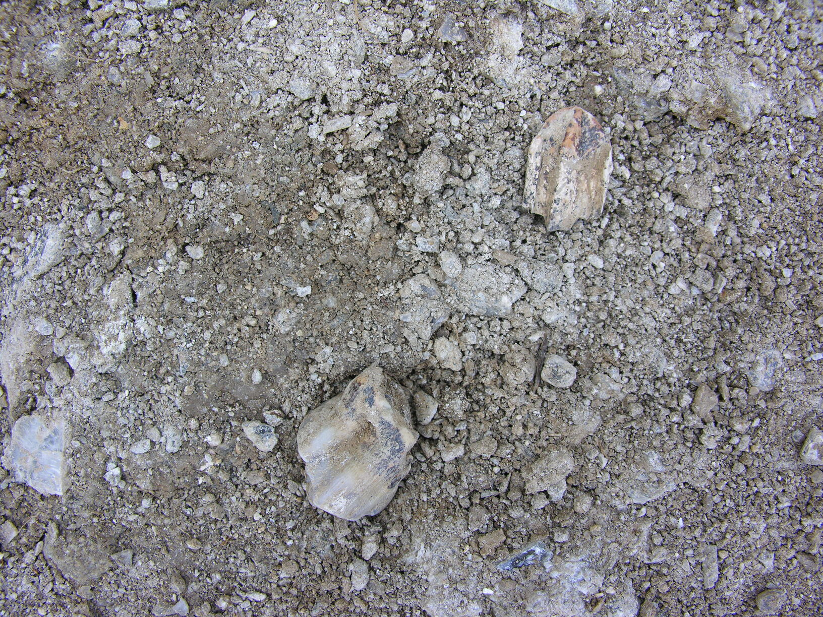 Fotografia che ritrae un quarto premolare inferiore di Megacero (reperto R. 10) (sotto) e un molare di un grande ungulato (reperto R. 11) (sopra) in fase di scavo