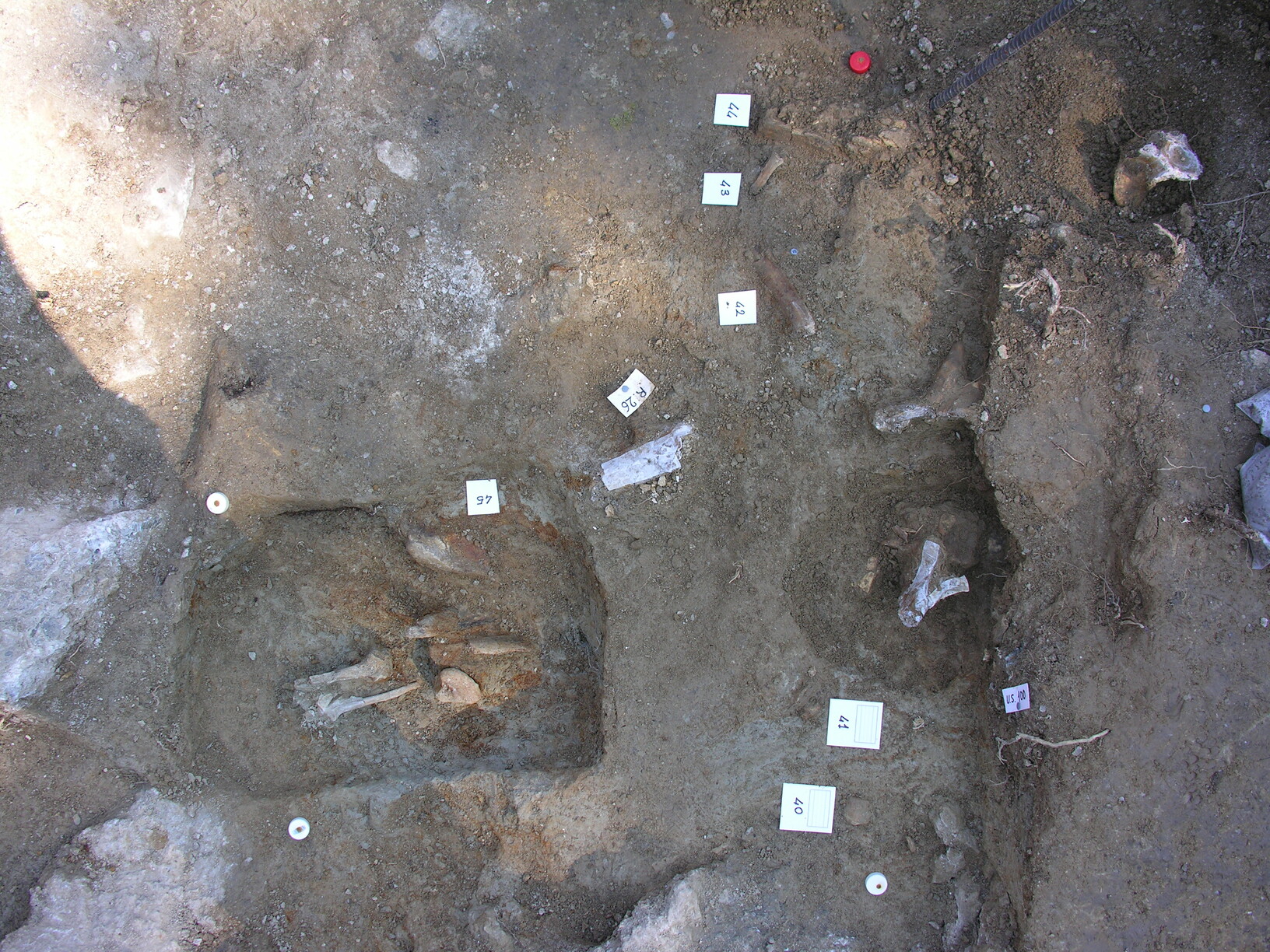 Fotopiano di area di scavo dell'US 100: reperti R. 26, R. 40, R. 41, R. 42, R. 43, R. 44 e R. 45