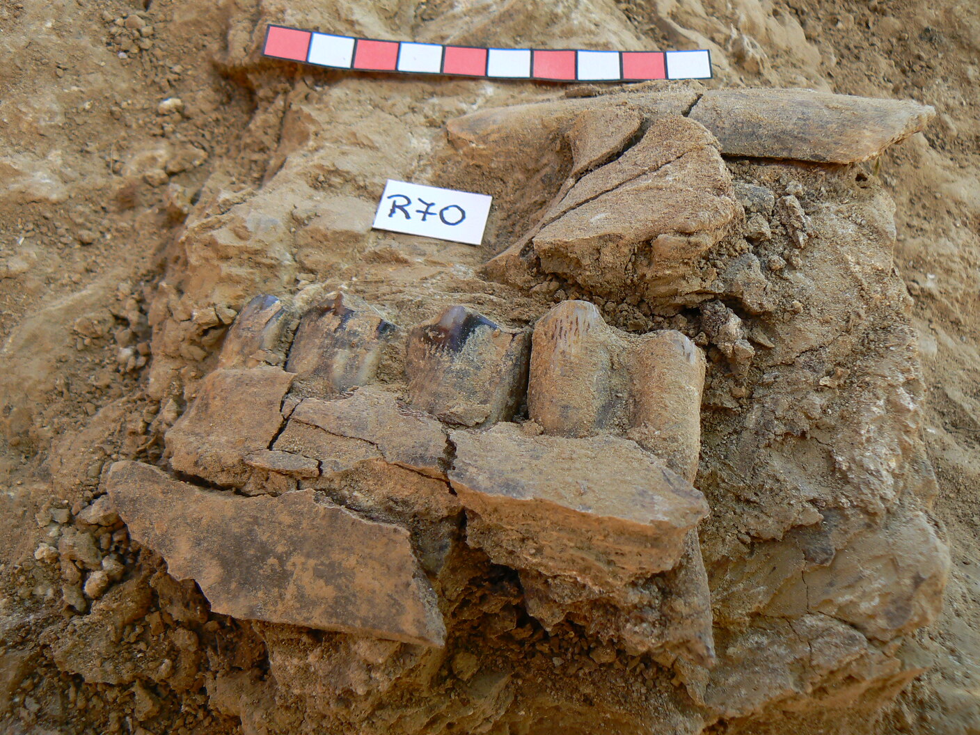 Fotografia che ritrae un frammento di mascellare con premolari e molari di Bisonte delle steppe (reperto R. 70) in fase di scavo
