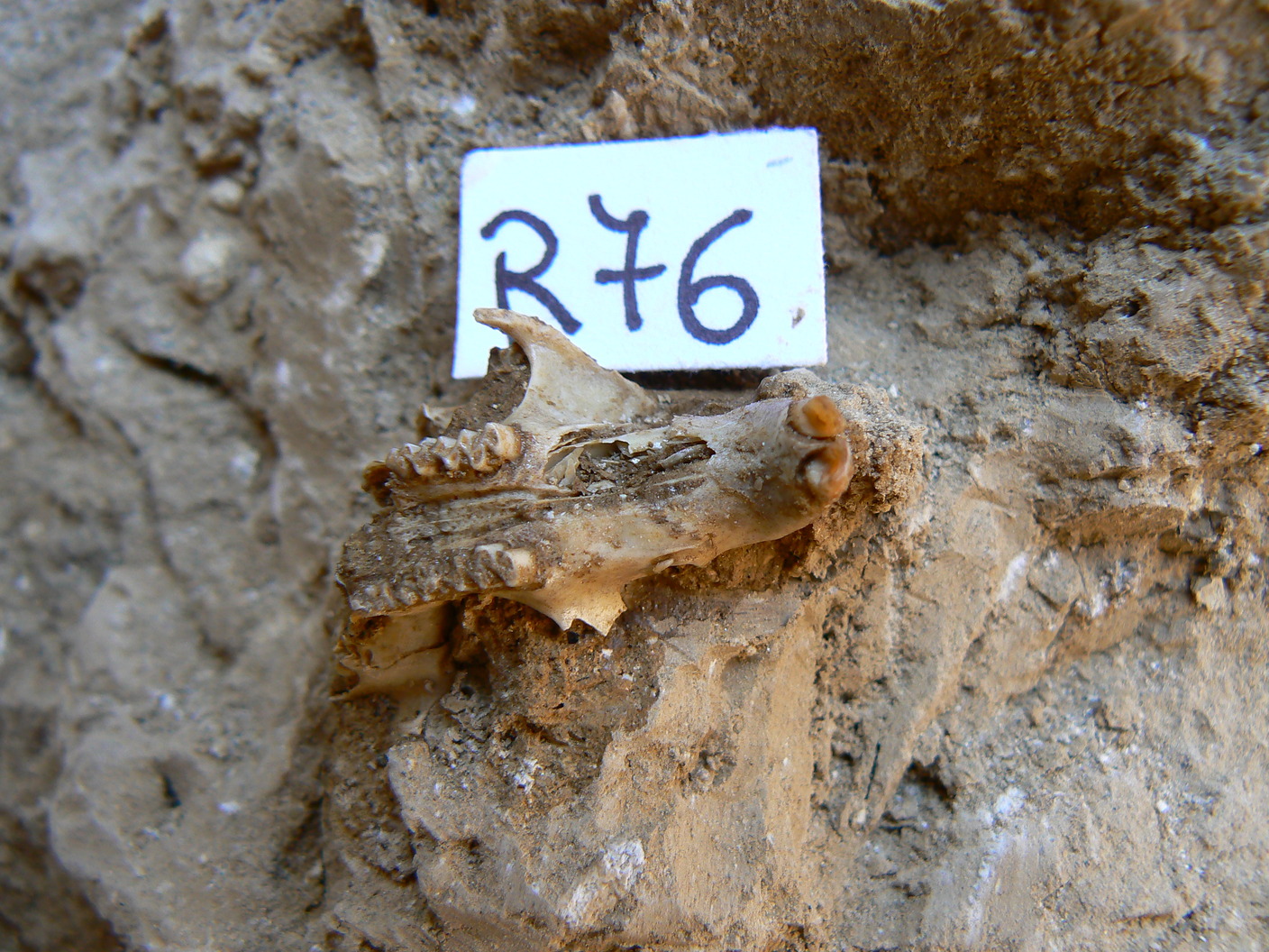 Fotografia che ritrae uno splancnocranio di Microtino (reperto R. 76) in fase di scavo