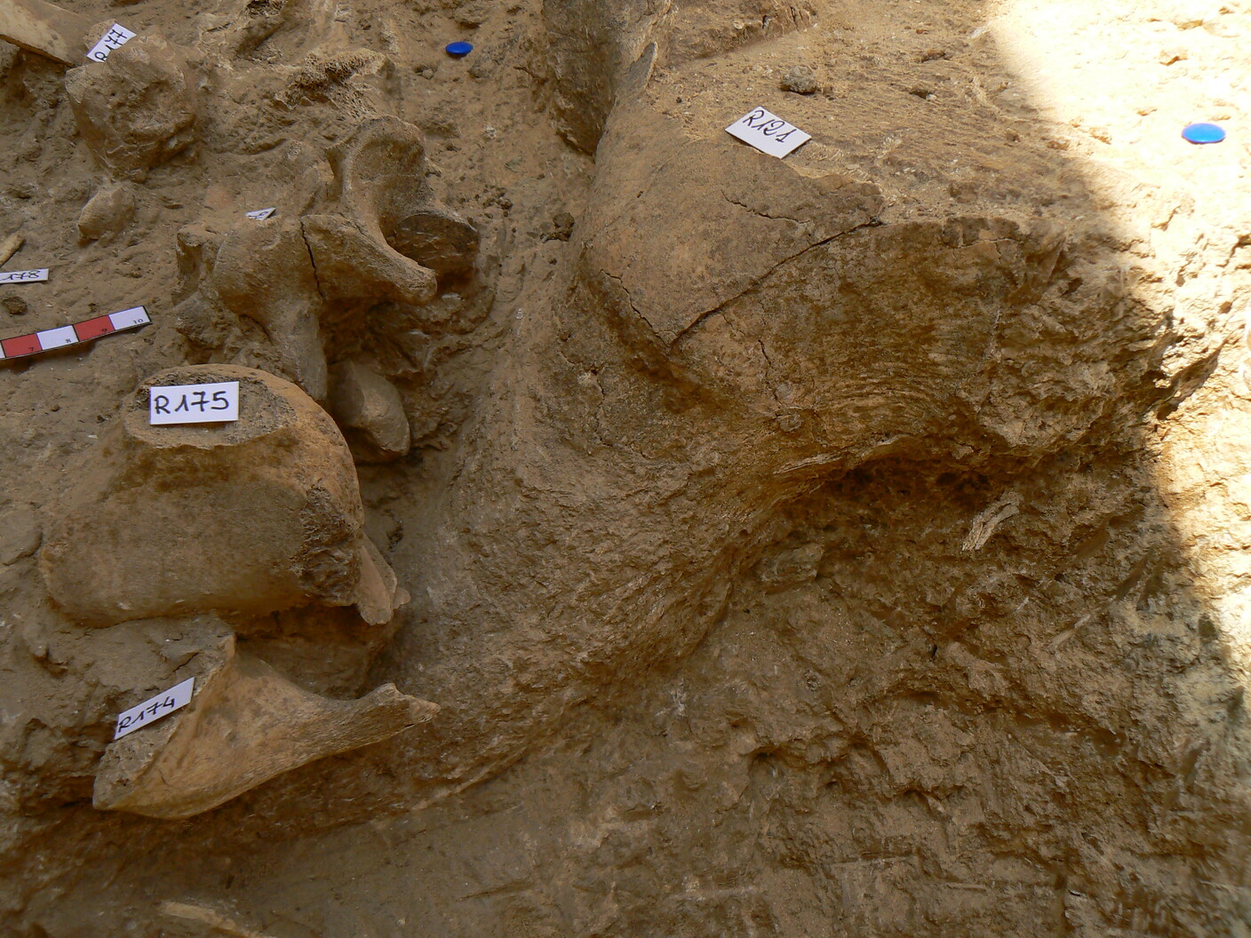 Fotografia che ritrae un accumulo di ossami in fase di scavo: reperti R. 121, R. 174 e R. 175