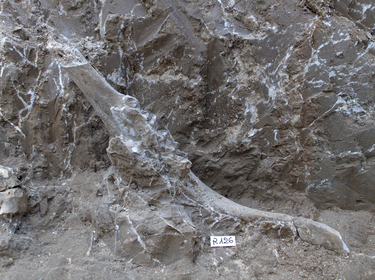 Fotografia che ritrae un'emimandibola di Artiodattilo (reperto R. 126) in fase di scavo
