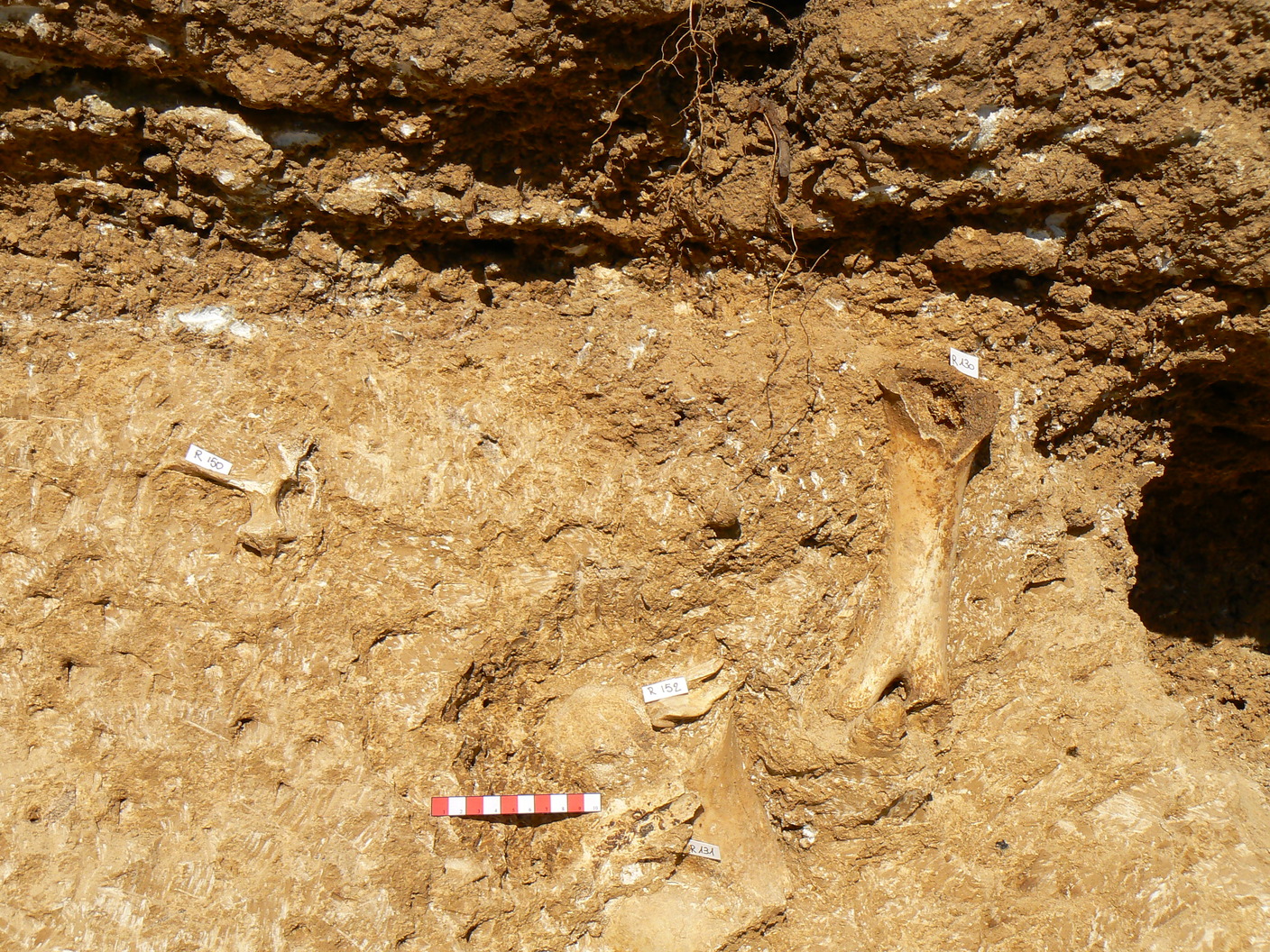 Fotografia che ritrae un accumulo di ossami in fase di scavo: reperti R. 130, R. 131, R. 150 e R. 152