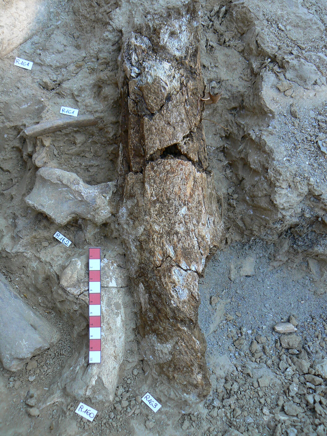 Fotografia che ritrae un accumulo di ossami in fase di scavo: reperti R. 160, R. 161, R. 162, R. 163 e R. 164