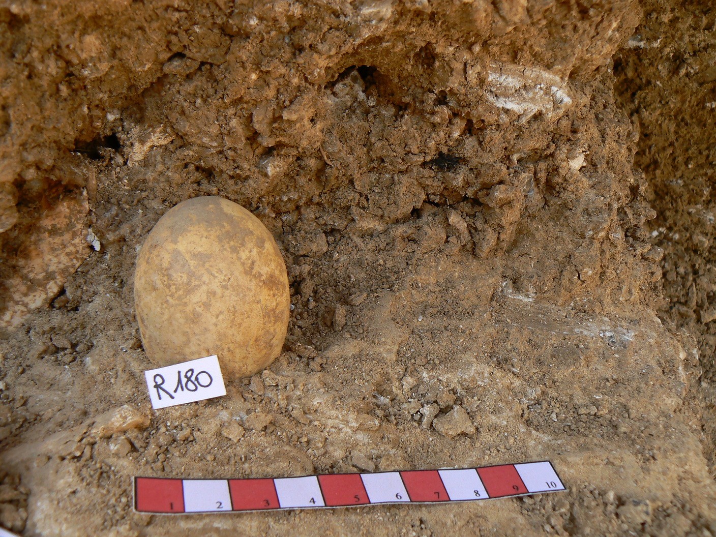 Fotografia che ritrae un ciottolo calcareo (reperto R. 180) in fase di scavo
