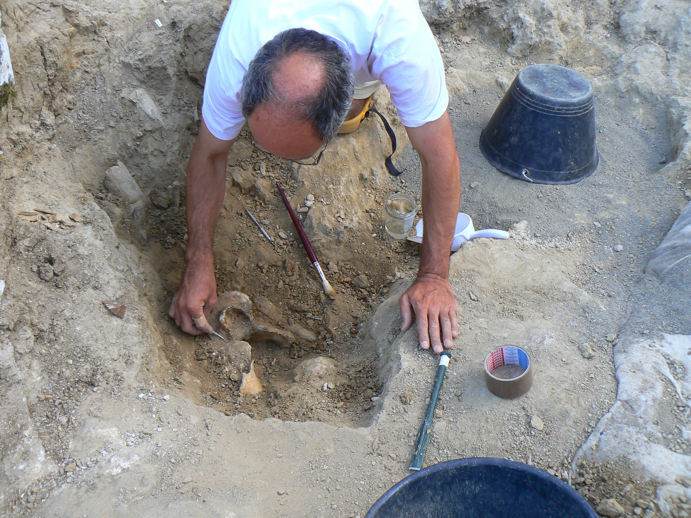 Fotografia che ritrae un accumulo di ossami in fase di scavo nell'US 99