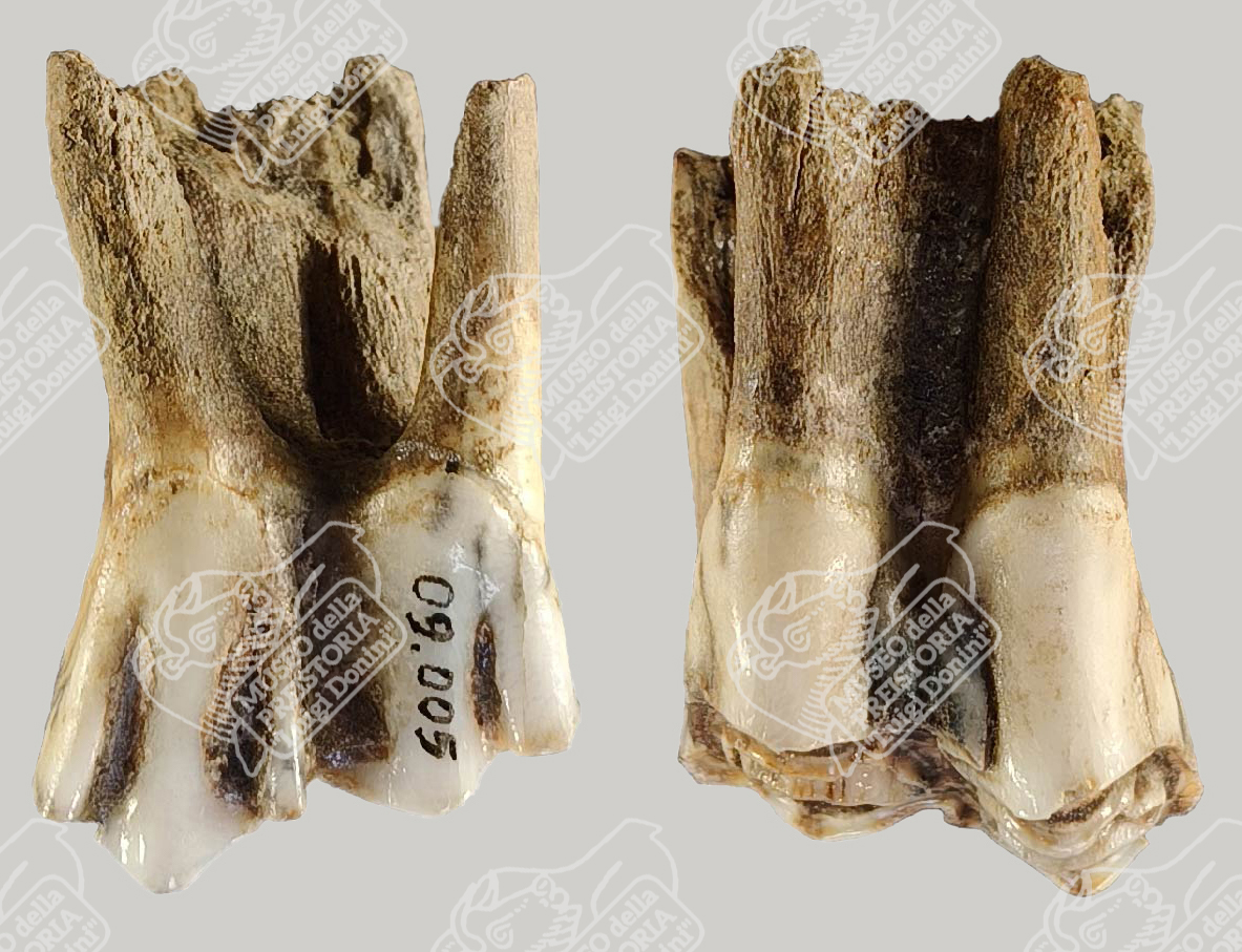 Molare superiore di Bisonte delle steppe in norma guanciale (sinistra) e in norma linguale (destra)