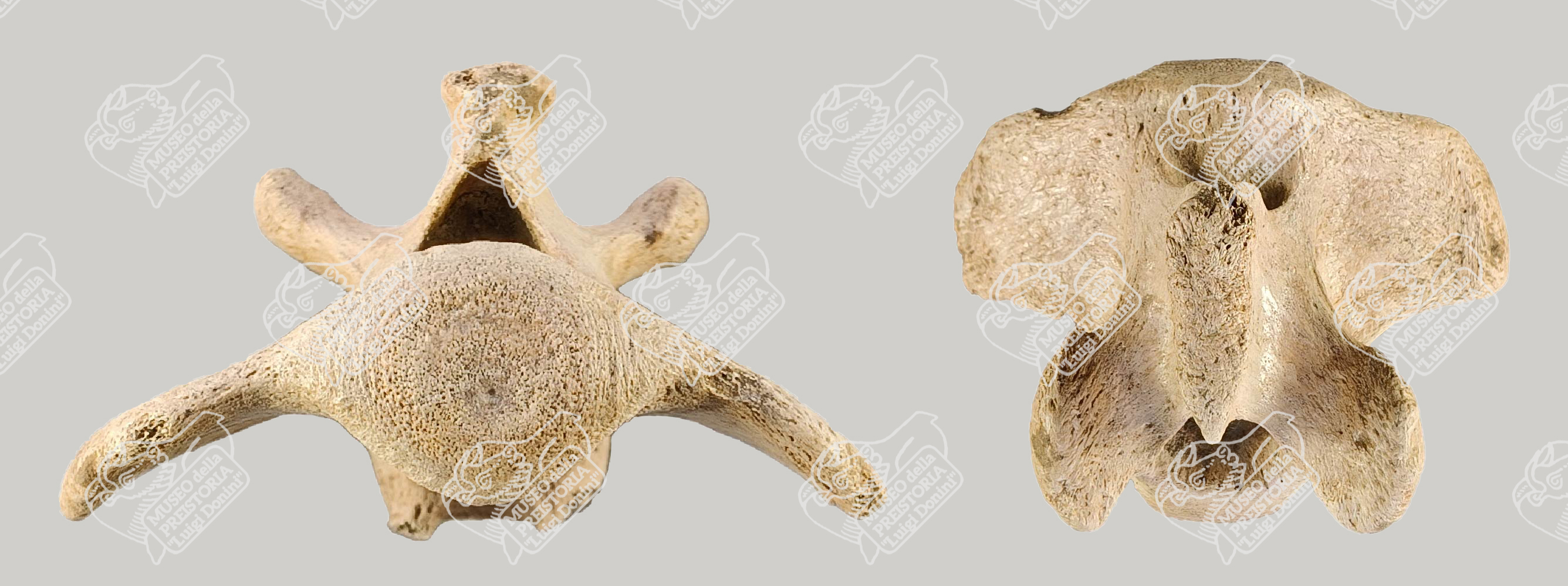 Vertebra caudale di Bisonte delle steppe in norma craniale (sinistra) e in norma dorsale (destra)