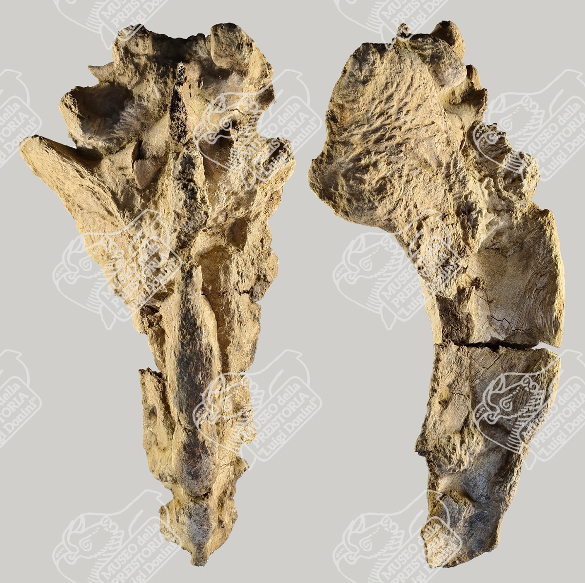 Sacro e ultime vertebre lombari di Bisonte delle steppe in norma dorsale (sinistra) e in norma laterale (destra)