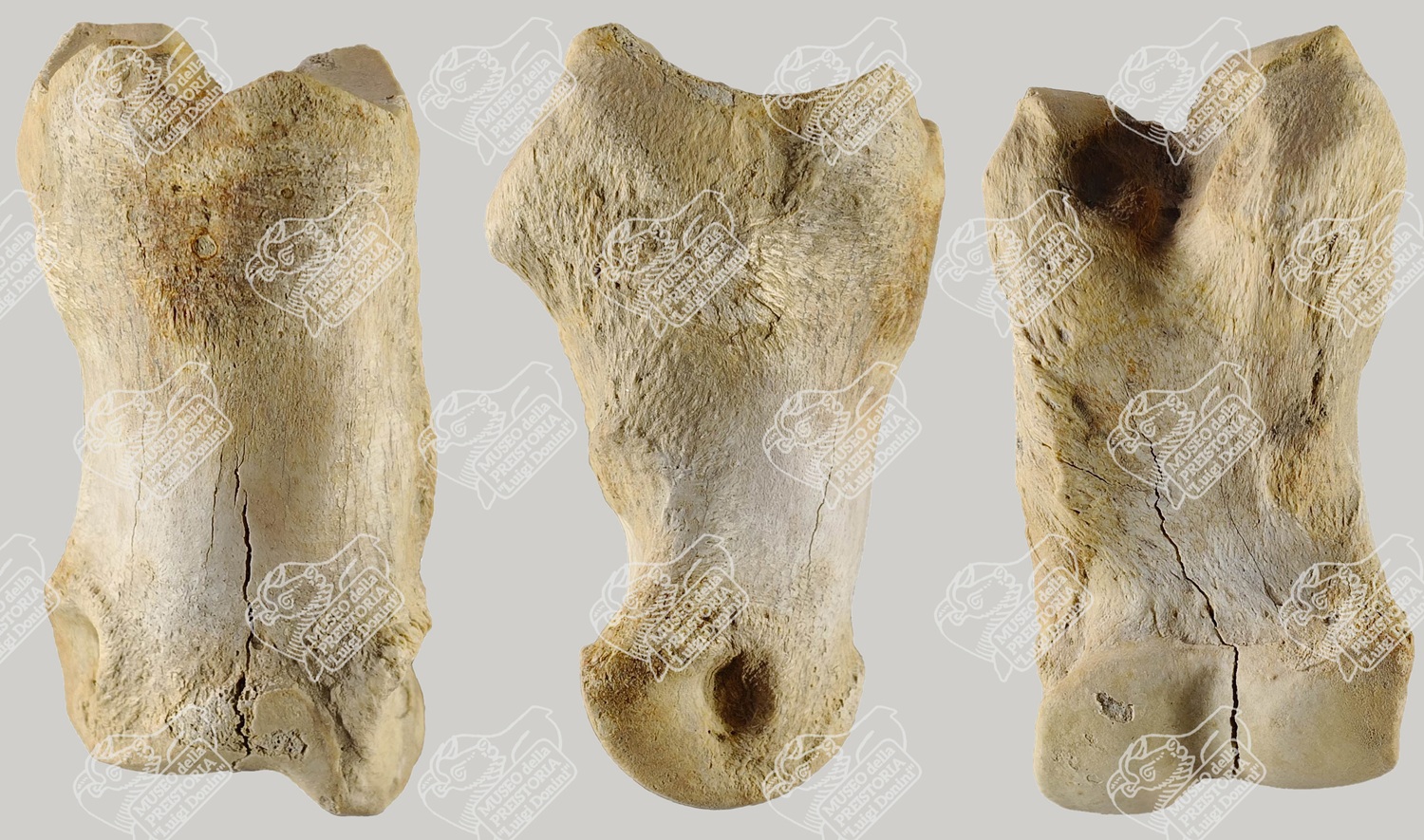 Prima falange di Bisonte delle steppe in norma dorsale (sinistra), in norma laterale (centrale) e in norma palmare (destra)