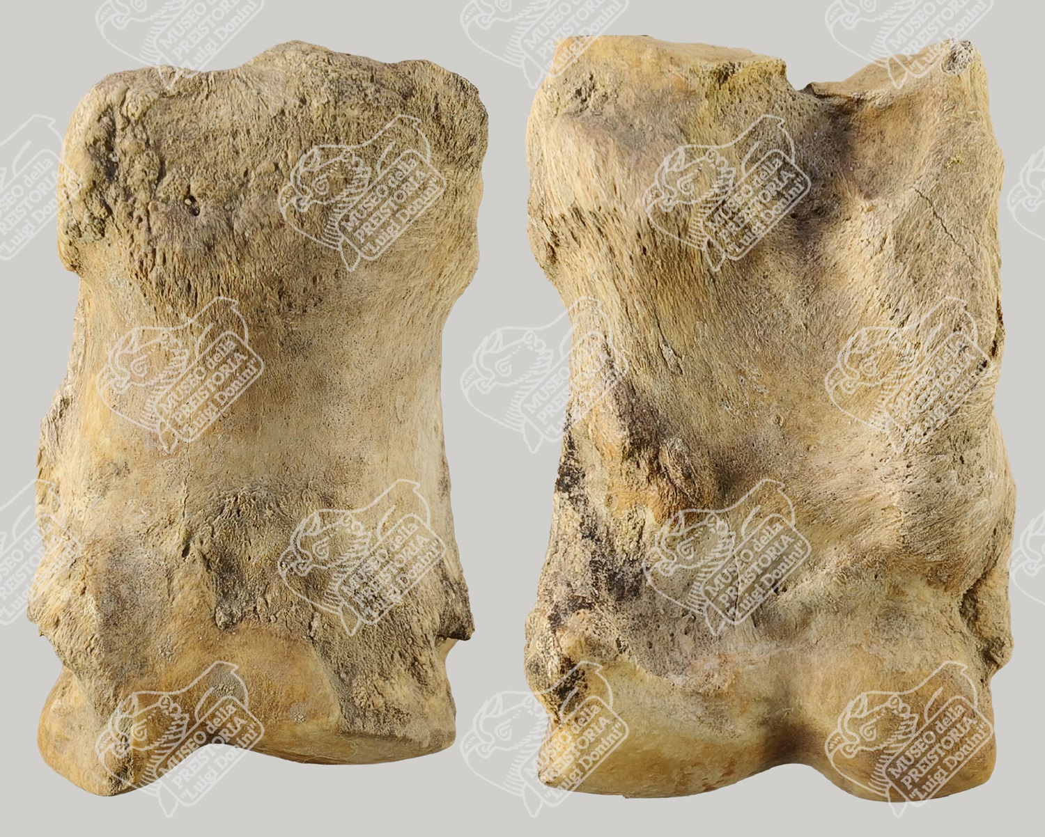 Prima falange di Bisonte delle steppe con segni di artrosi in norma dorsale (sinistra) e in norma palmare (destra)
