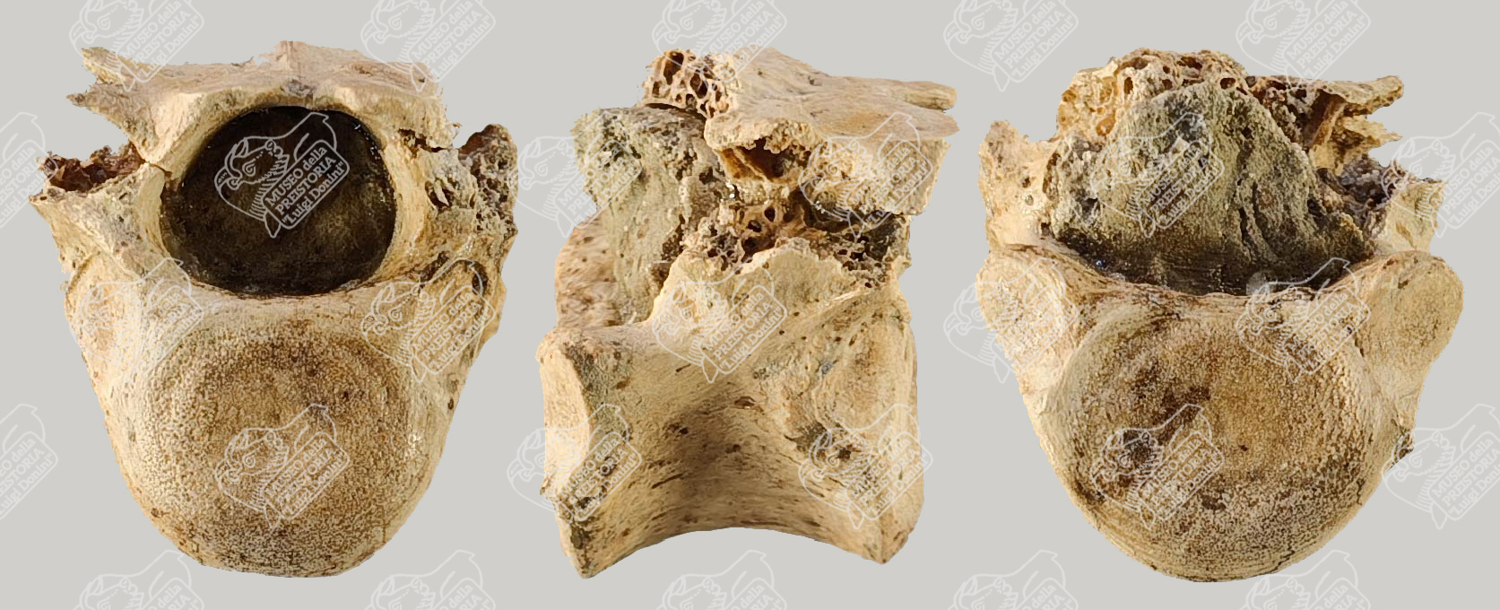 Vertebra dorsale di Lupo in norma craniale (sinistra), in norma laterale (centrale) e in norma caudale (destra)