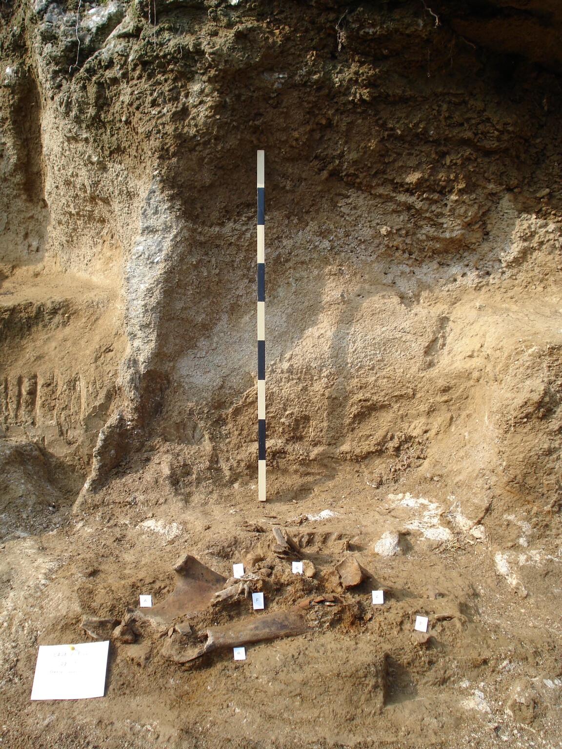 Fotografia che ritrae un accumulo di ossami in fase di scavo vicino alla parete della cavità carsica dell'inghiottitoio