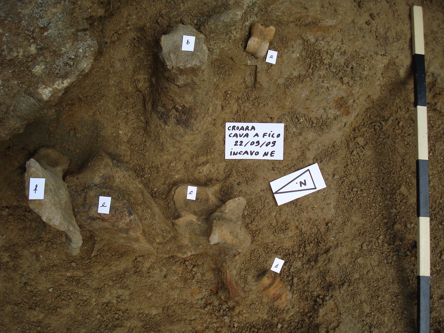 Fotografia che ritrae un accumulo di ossami in fase di scavo: reperti 09.028, 09.029, 09,030, 09.031, 09.932 e 09.033