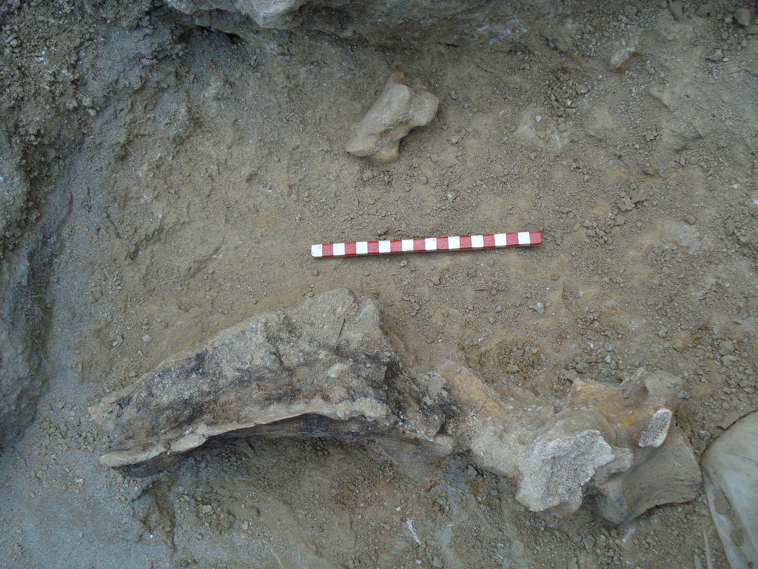 Fotografia che ritrae un accumulo di ossami in fase di scavo: reperti 11.007 e 11.010