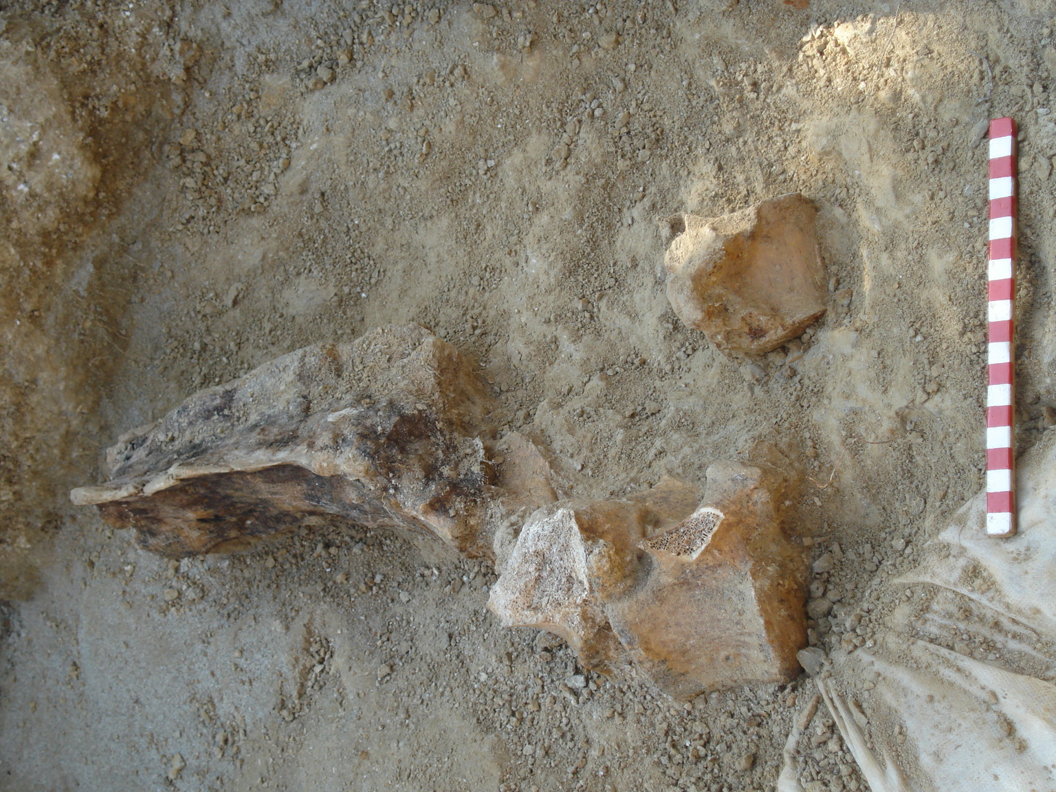 Fotografia che ritrae un accumulo di ossami in fase di scavo: reperti 11.006, 11.007 e 11.010