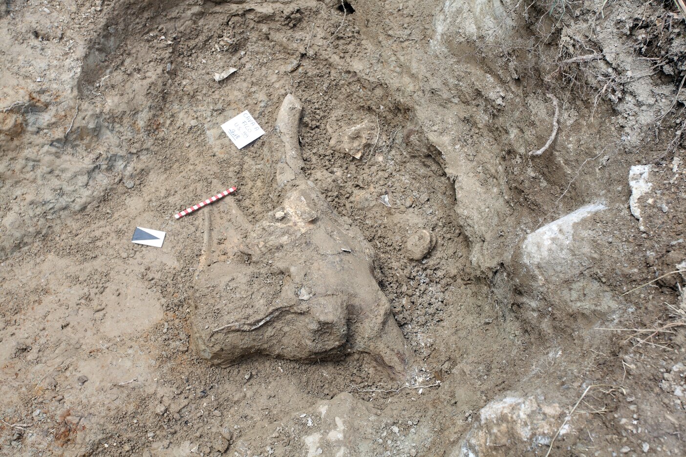 Fotografia che ritrae un cranio completo di Bisonte delle steppe (reperto 18.083) in fase di scavo e, sotto di esso, l'emergere di una scapola di Bisonte delle steppe (reperto 18.104)