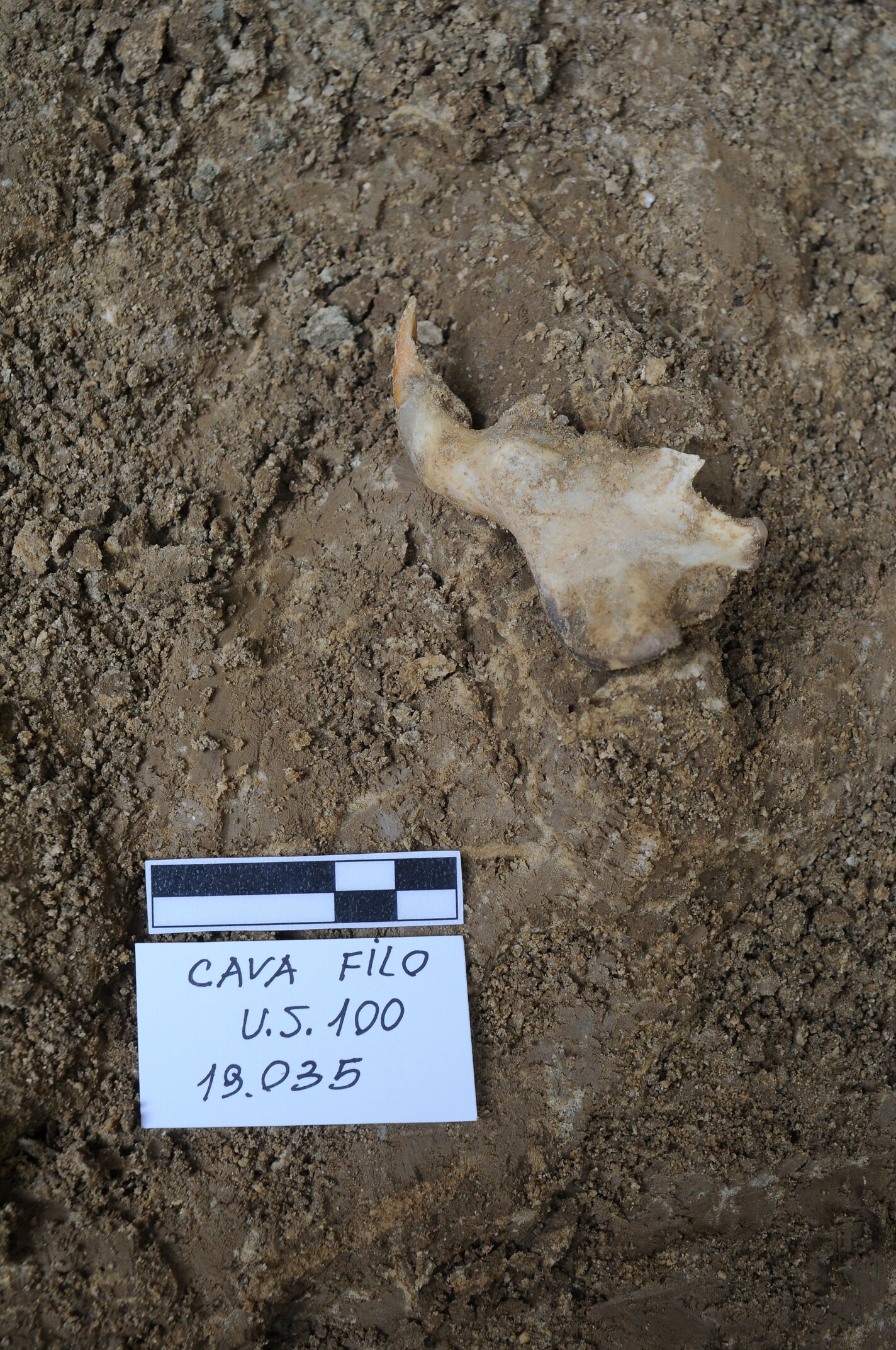 Fotografia che ritrae un'emimandibola con dentatura di Marmotta (reperto 19.035) in fase di scavo