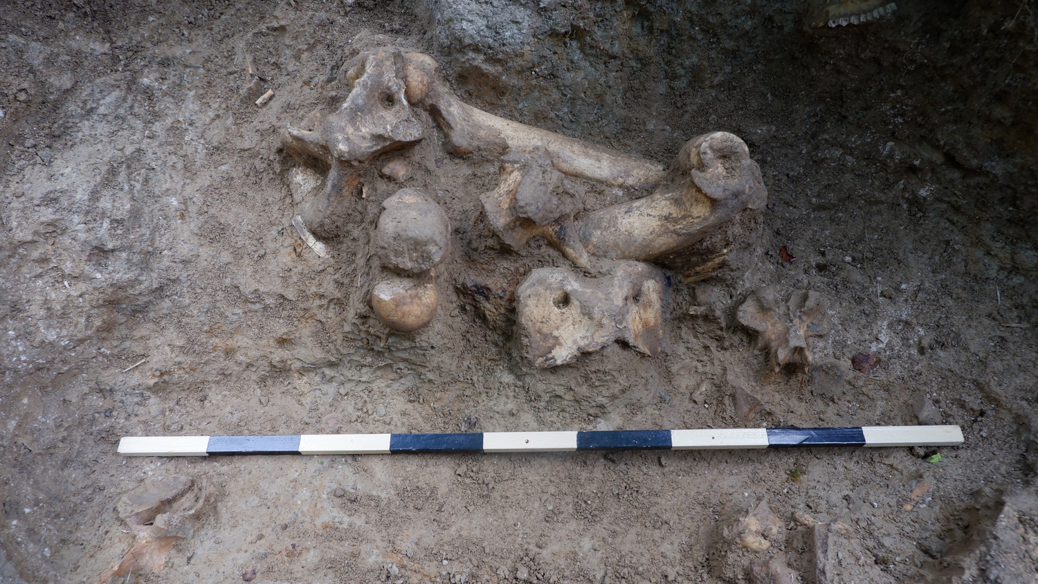 Fotografia che ritrae un accumulo di ossami in fase di scavo nell'US 99