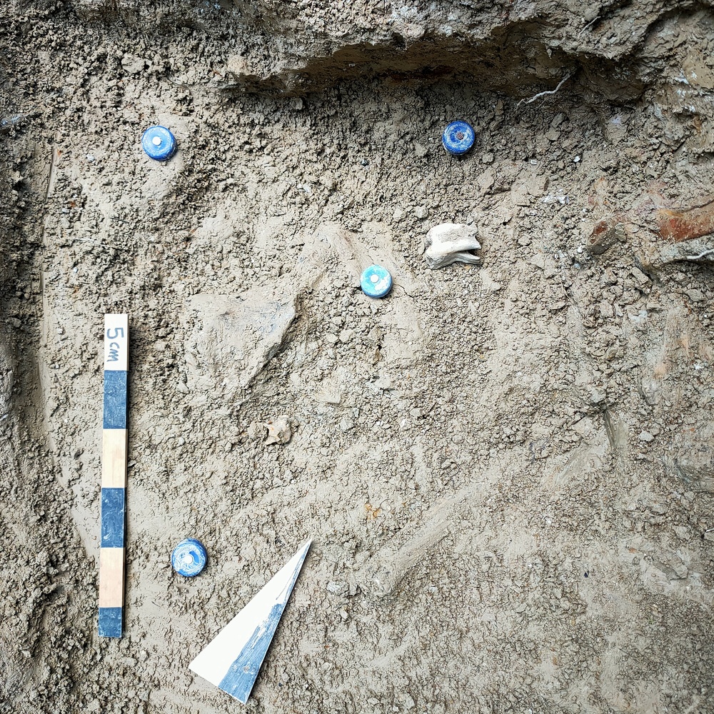 Fotografia che ritrae un accumulo di ossami in fase di scavo nell'US 166