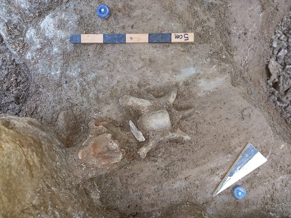 Fotografia che ritrae una vertebra cervicale di Bisonte delle steppe (reperto 22.074) in fase di scavo