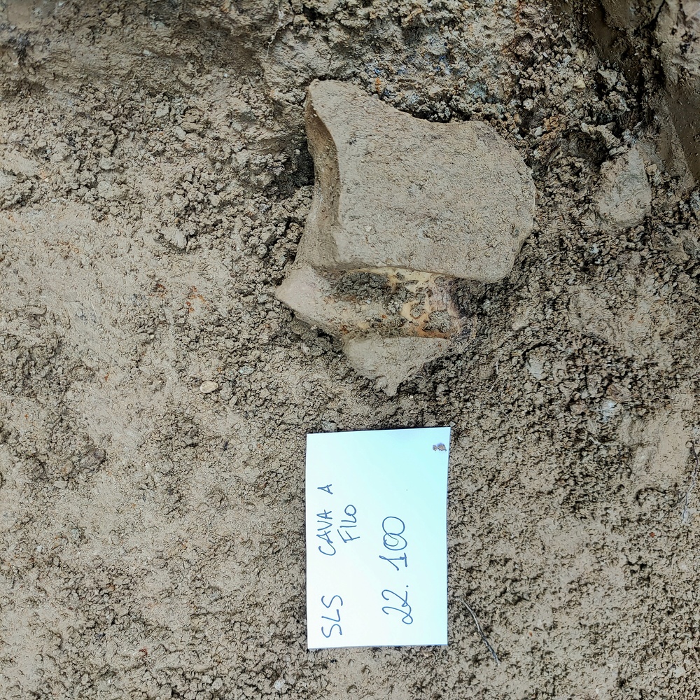 Fotografia che ritrae un dettaglio di una vertebra toracica di Bisonte delle steppe con tracce di lavorazione antropica (reperto 22.100) in fase di scavo