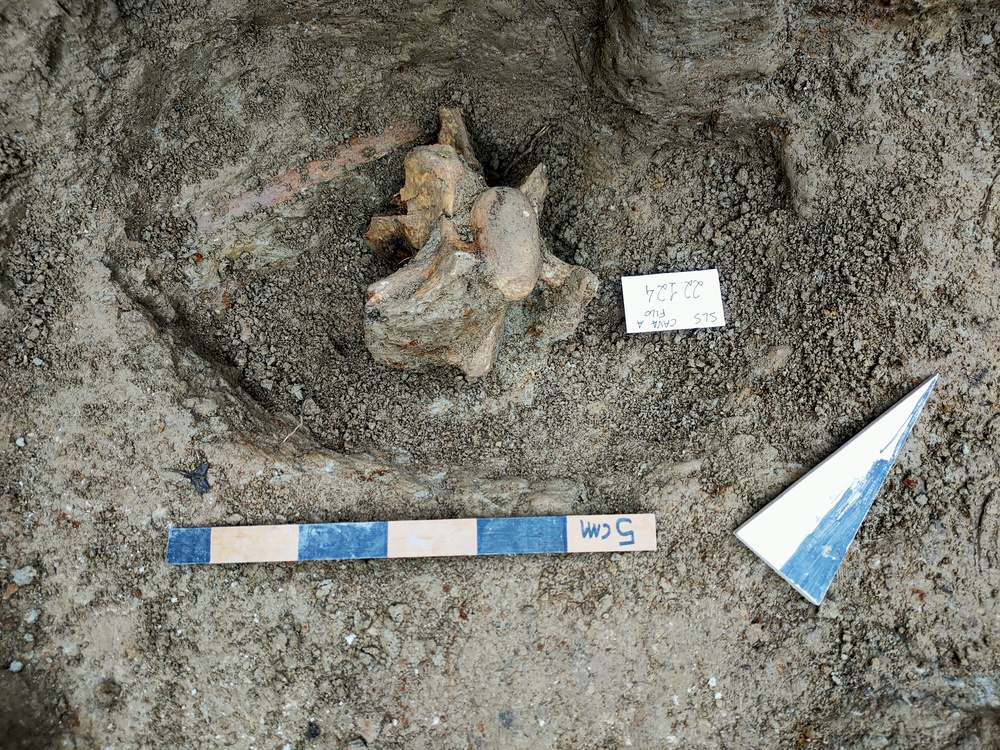 Fotografia che ritrae un dettaglio di una vertebra cervicale di Bisonte delle steppe (reperto 22.124) in fase di scavo