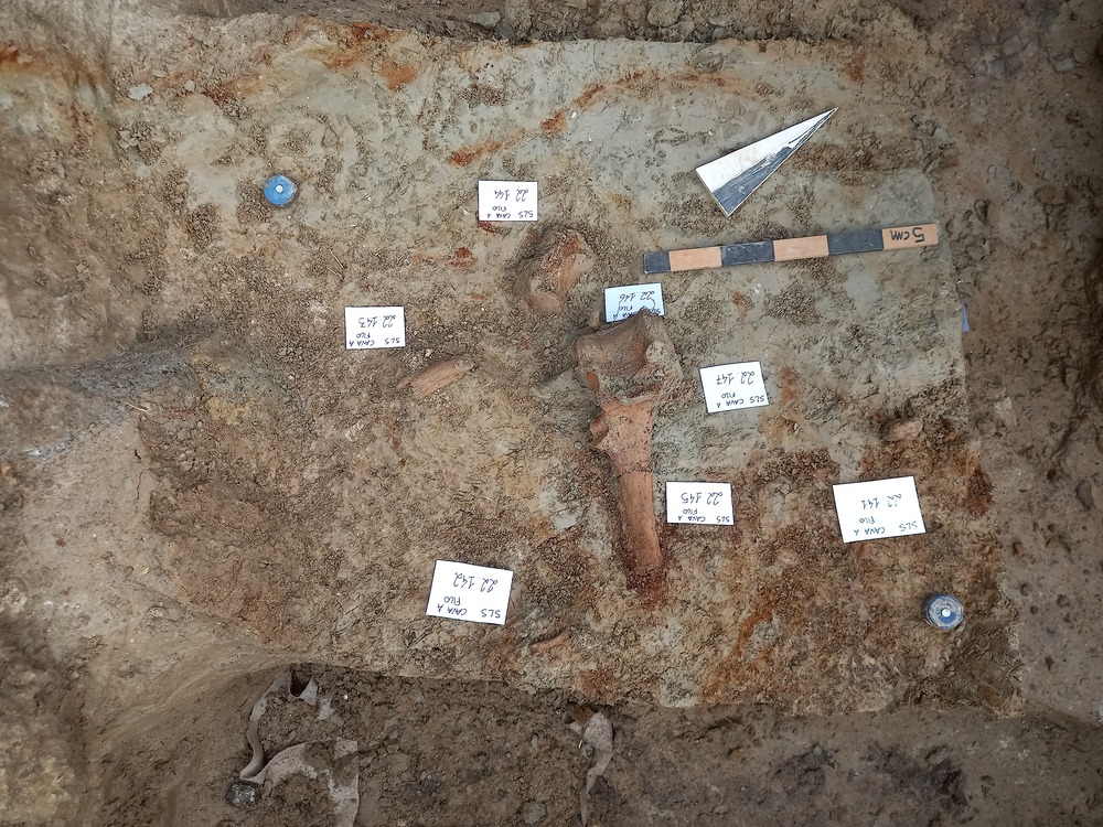Fotografia che ritrae un accumulo di ossami in fase di scavo: reperti 22.141, 22.142, 22.143, 22.144, 22.145, 22.146 e 22.147