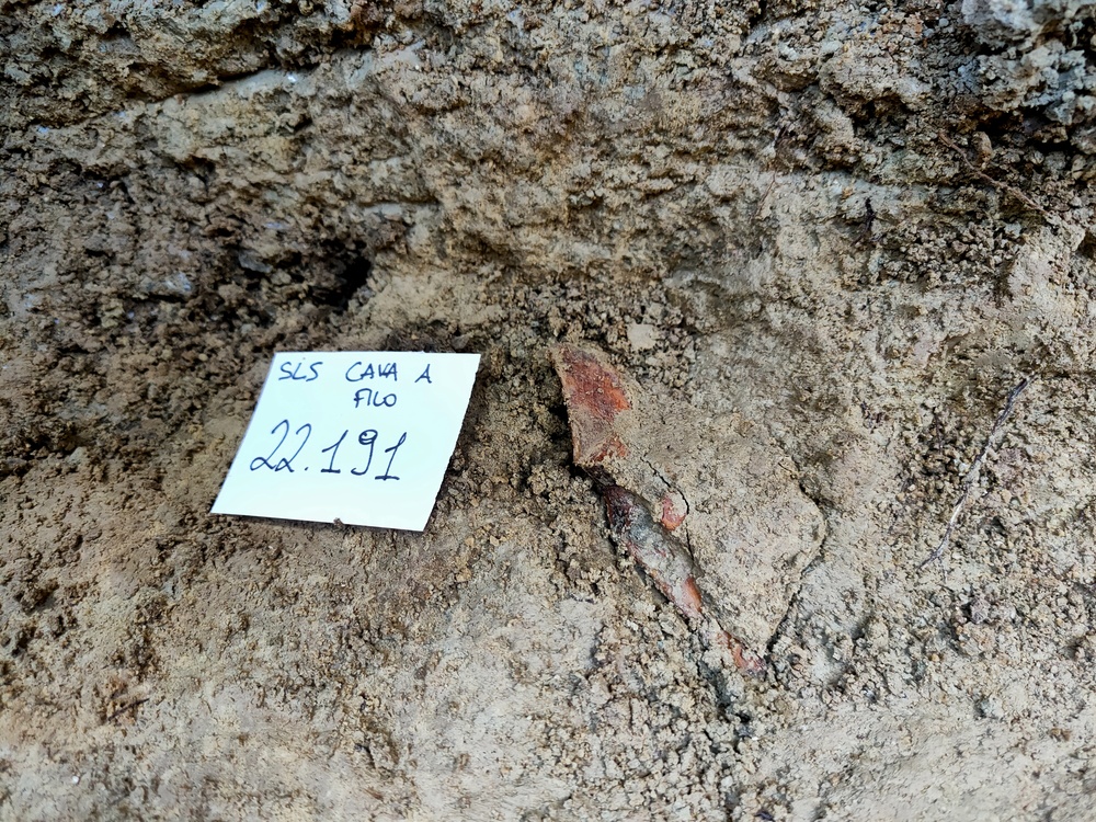 Fotografia che ritrae un'ulna di Capriolo (reperto 22.191) in fase di scavo