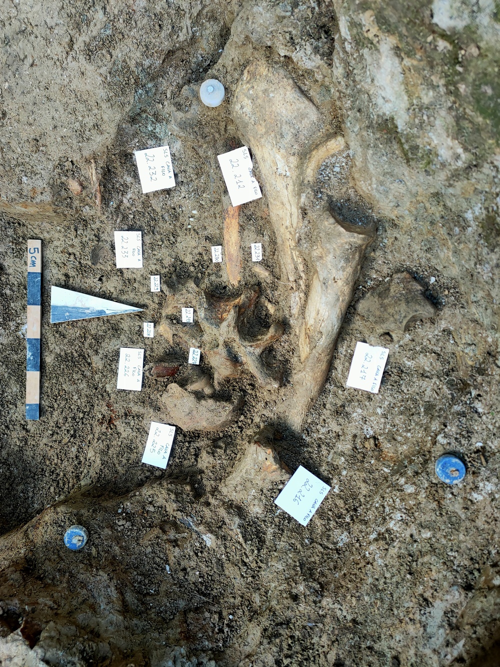 Fotografia che ritrae un accumulo di ossami in fase di scavo: reperti 22.212, 22.213, 22.216, 22.217, 22.225, 22.226, 22.227, 22.228, 22.229, 22.230, 22.231, 22.232 e 22.233