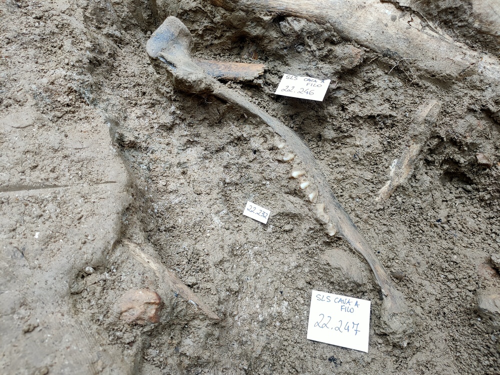 Fotografia che ritrae un'emimandibola di Bisonte delle steppe (reperto 22.232) in fase di scavo