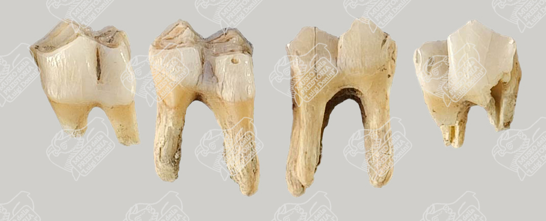 Molare di Capriolo in norma linguale (all'estrema sinistra), e in norma guanciale (all'estrema destra); premolare di Capriolo in norma linguale (a sinistra) e in norma guanciale (a destra)