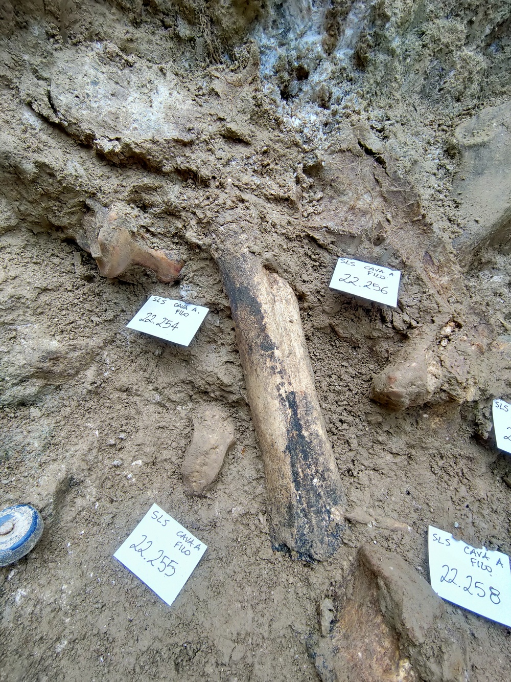 Fotografia che ritrae un accumulo di ossami in fase di scavo: reperti 22.254, 22.255, 22.256, 22.257 e 22.258