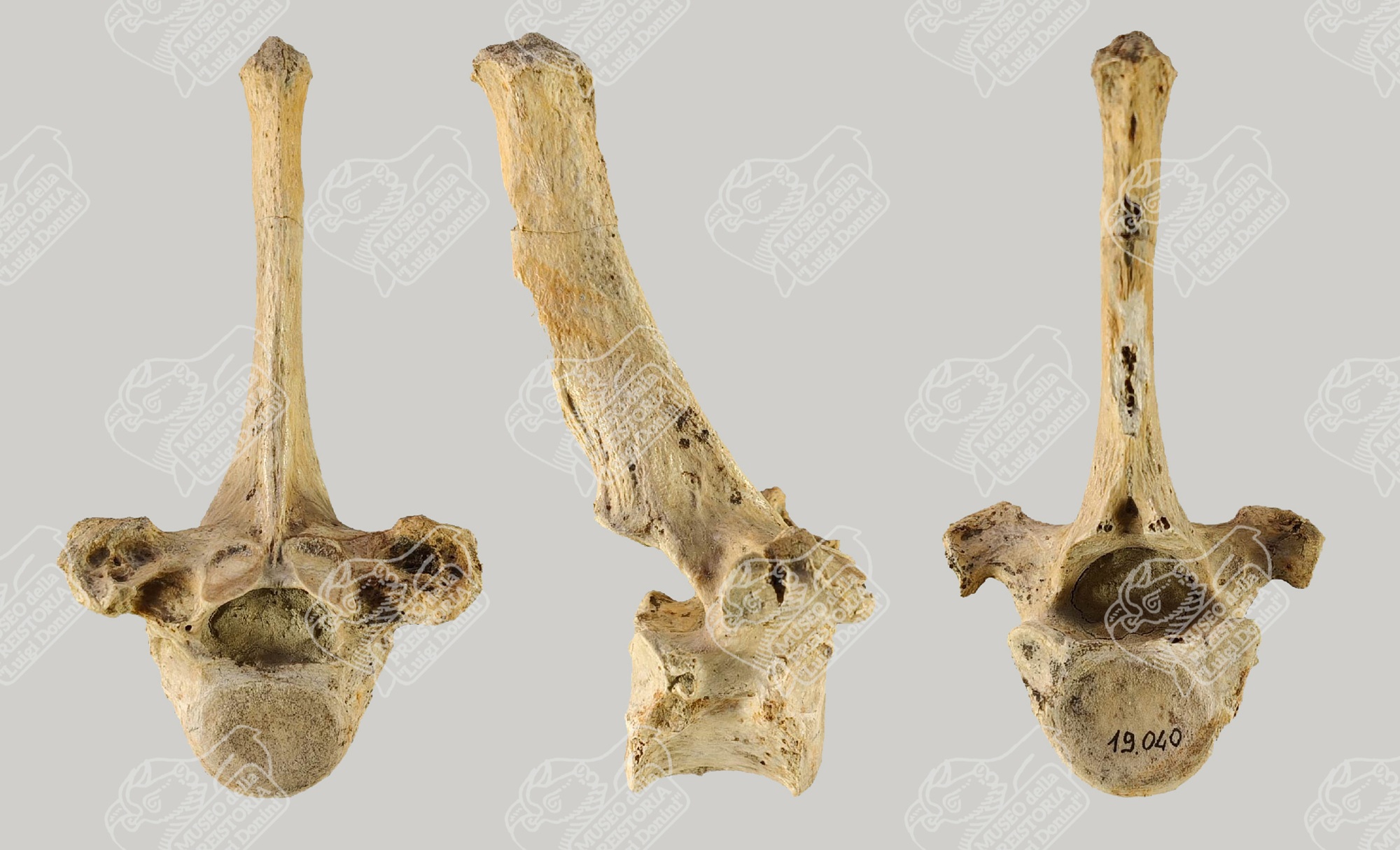 Vertebra toracica di Lupo in norma craniale (sinistra), in norma laterale (centrale) e in norma caudale (destra)