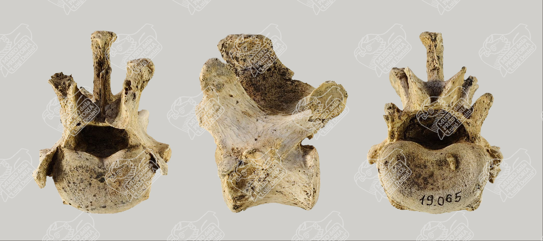 Vertebra di Lupo in norma craniale (sinistra), in norma laterale (centrale) e in norma caudale (destra)
