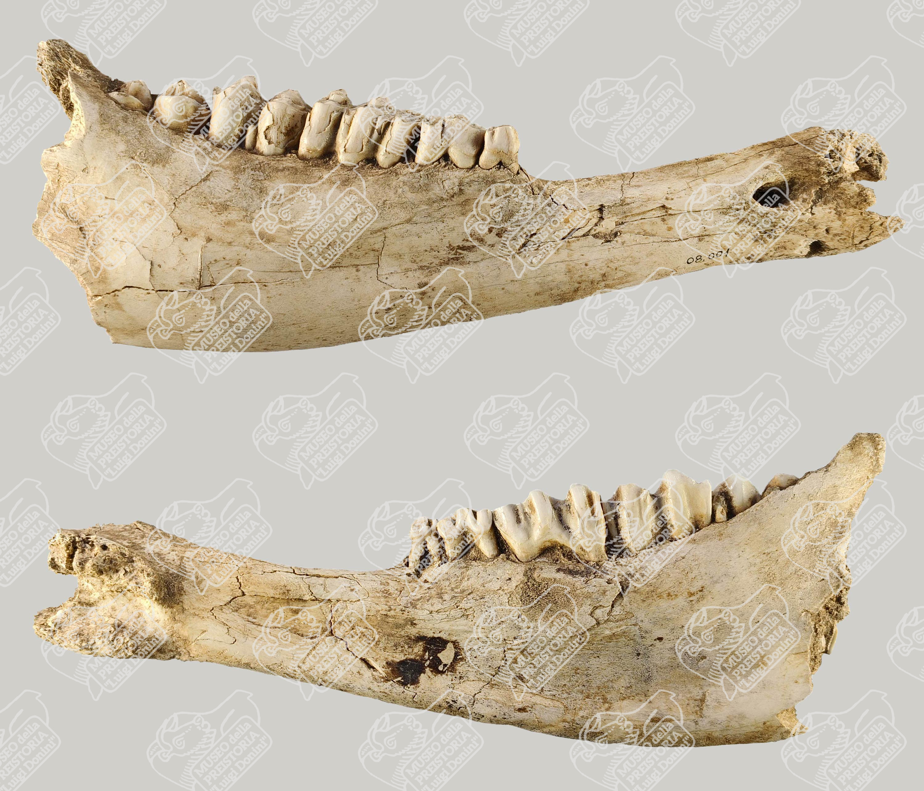 Emimandibola di giovane individuo di Bisonte delle steppe con molari e premolari in norma guanciale (sopra) e linguale (sotto)