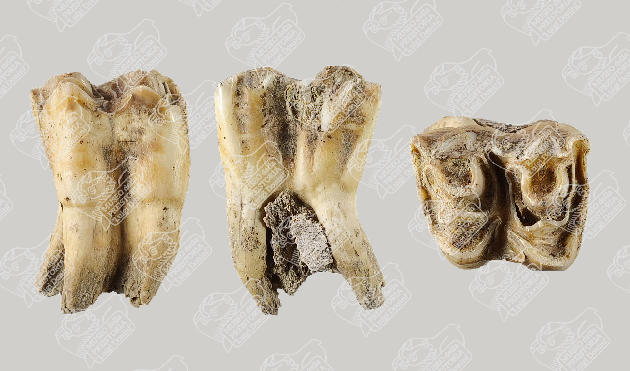 Molare di Bisonte delle steppe in norma guanciale (sinistra), in norma linguale (centrale) e in norma occlusale (destra)