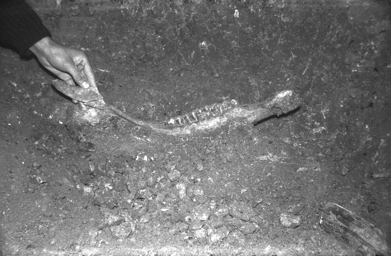 Fotografia che ritrae un'emimandibola di un grosso erbivoro in fase di scavo nel 1967
