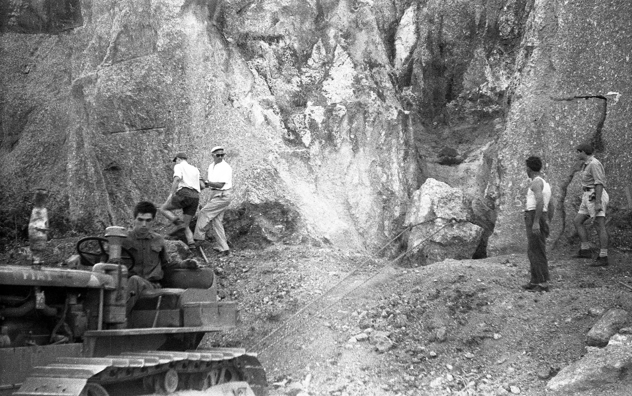 Fotografia che ritrae la rimozione di blocchi di roccia che ostacolano la prosecuzione degli scavi nel 1964