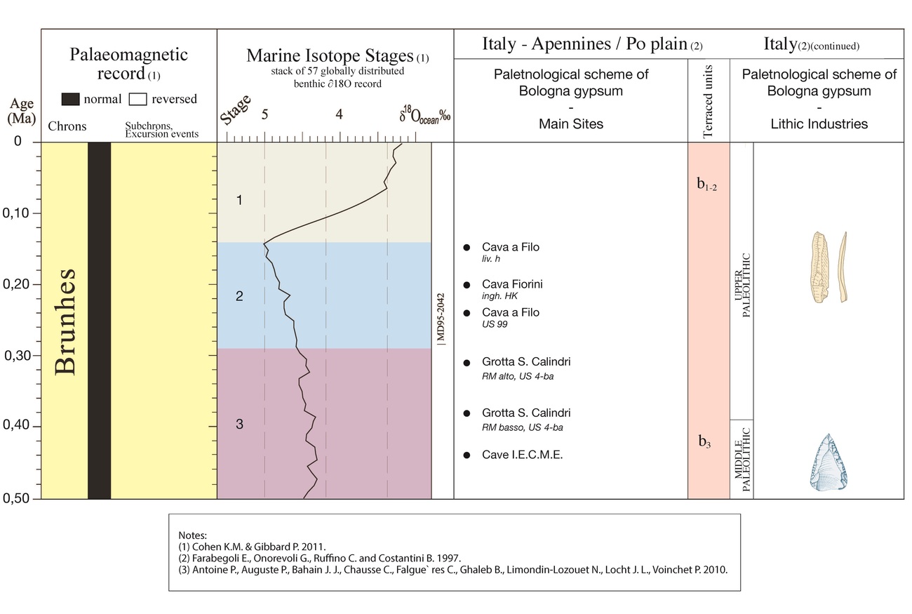 Schema con correlazione dei depositi antropici con dati paleomagnetici e gli stadi isotopici marini (Pleistocene Superiore)