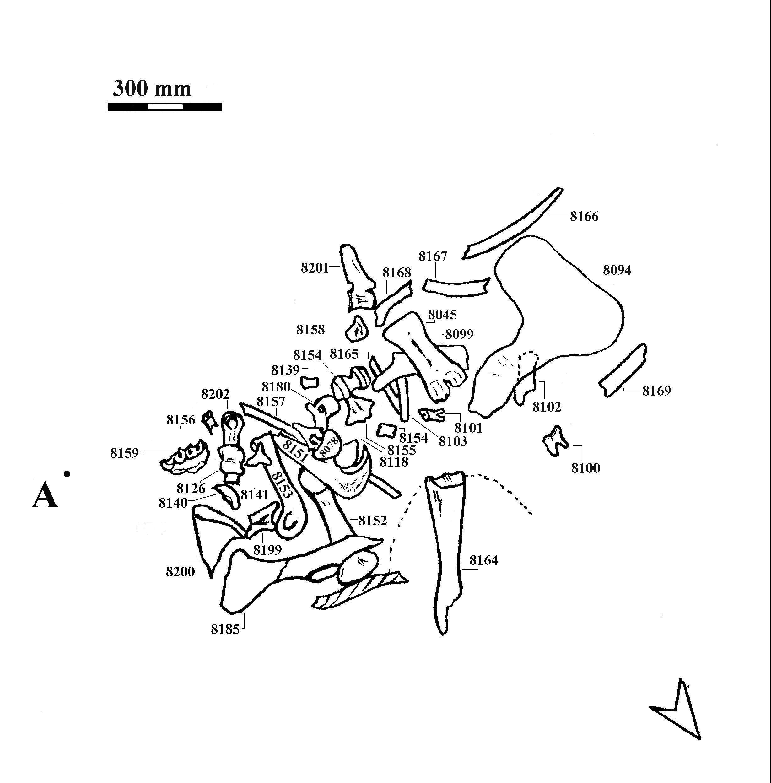 Schema grafico dell’accumulo di resti fossili nell'US 99, che evidenzia la loro distribuzione caotica. La freccia indica la direzione del nord, mentre “A” è il punto quotato