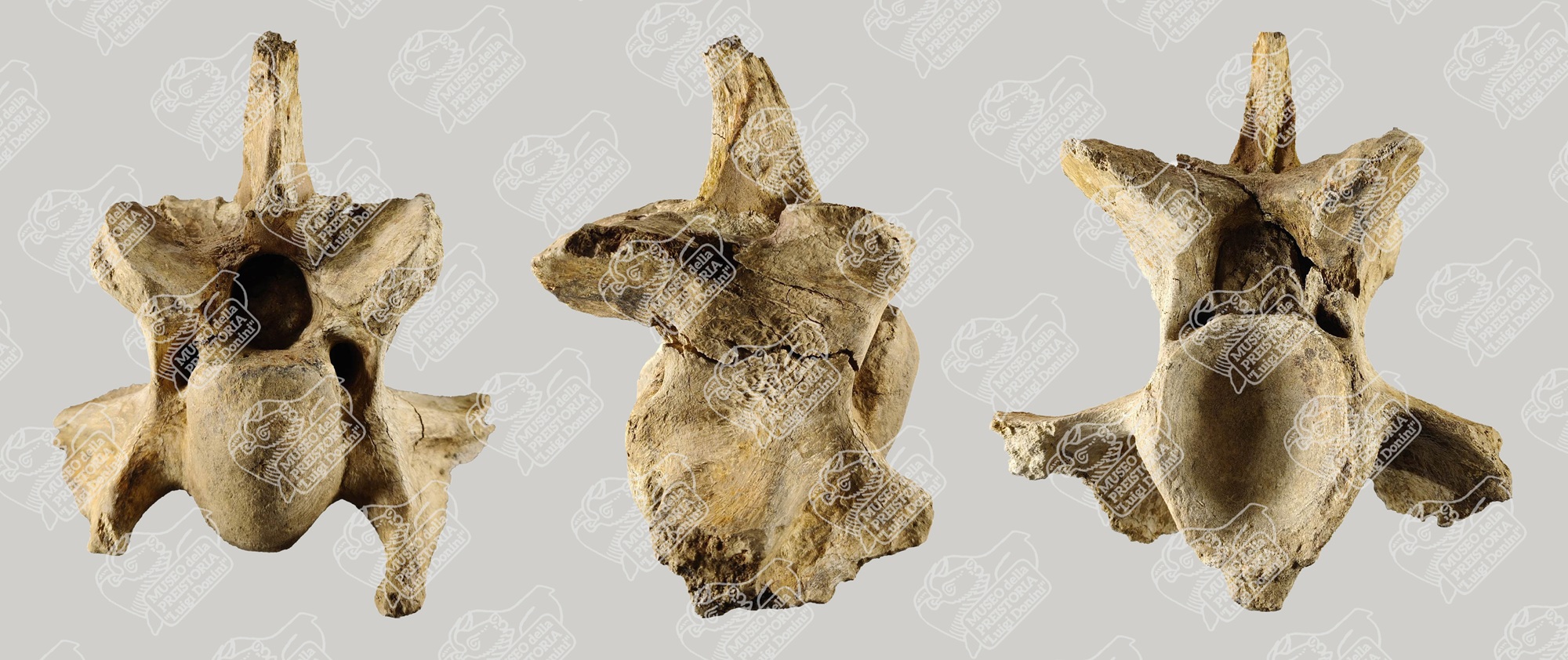 Vertebra cervicale di Bisonte delle steppe in norma craniale (sinistra), laterale (centro) e caudale (destra)
