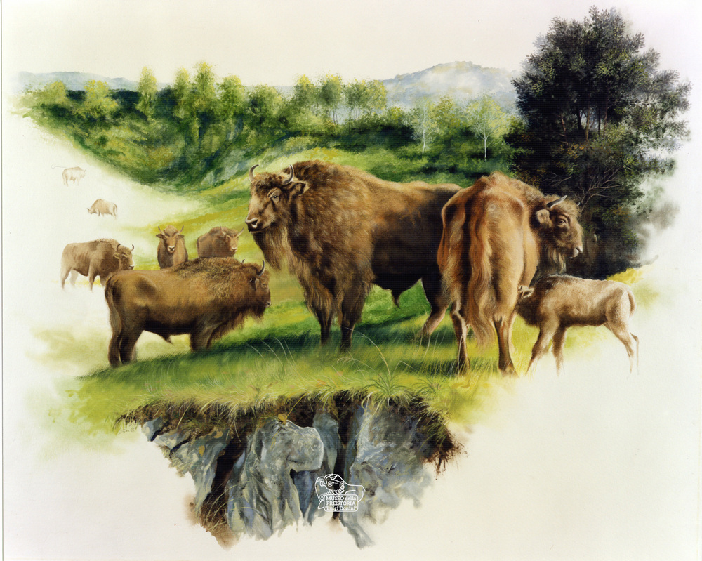 Raffigurazione pittorica di bisonte delle steppe con mandria al pascolo