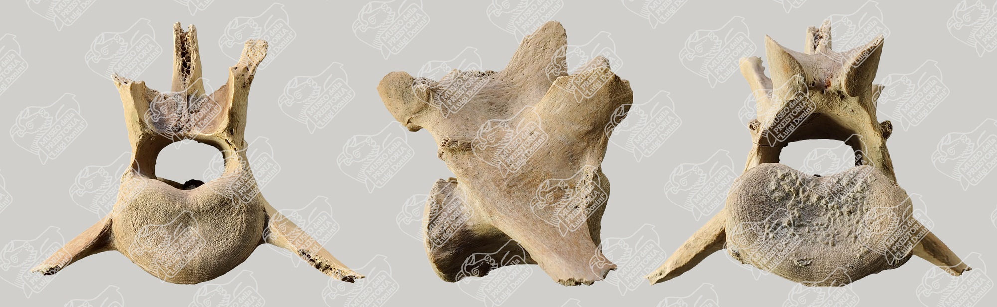 Vertebra cervicale di Lupo in norma craniale (sinistra), in norma laterale (centro) e in norma caudale (destra)