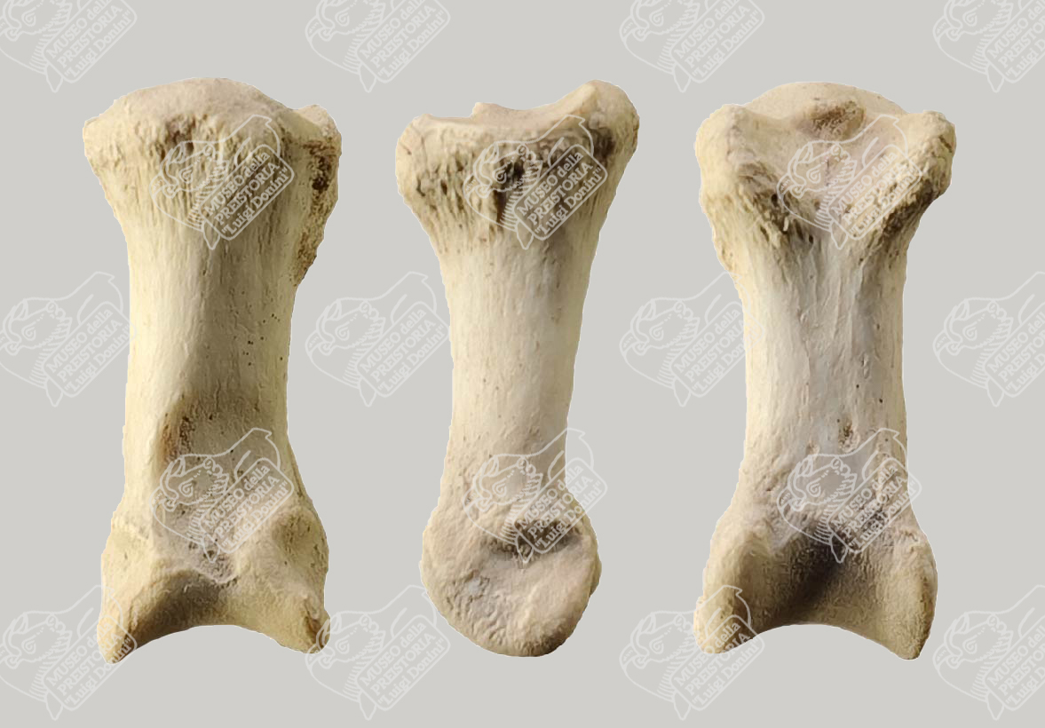 Seconda falange di Lupo in norma dorsale (sinistra), in norma laterale (centro) e in norma palmare (destra)